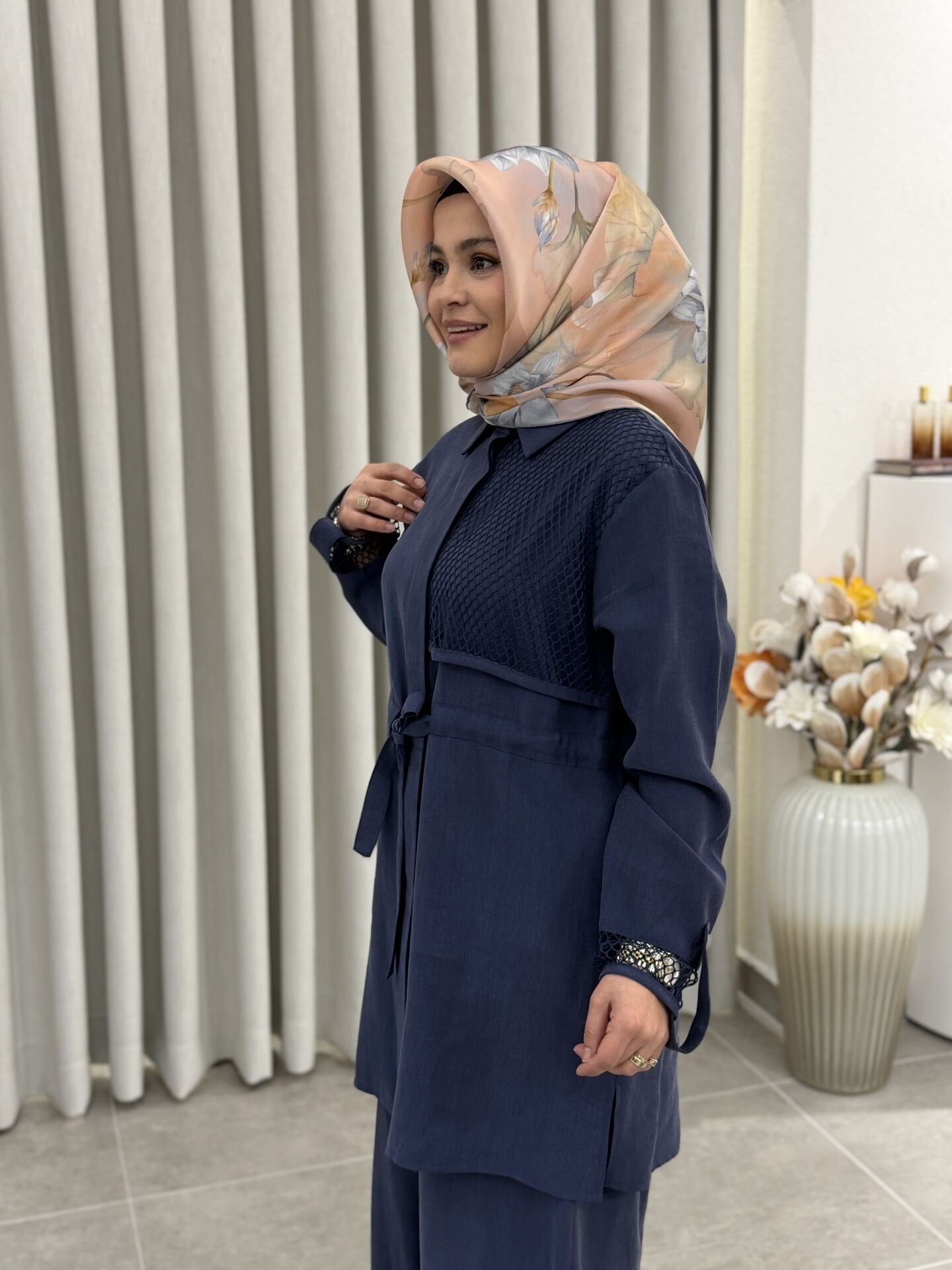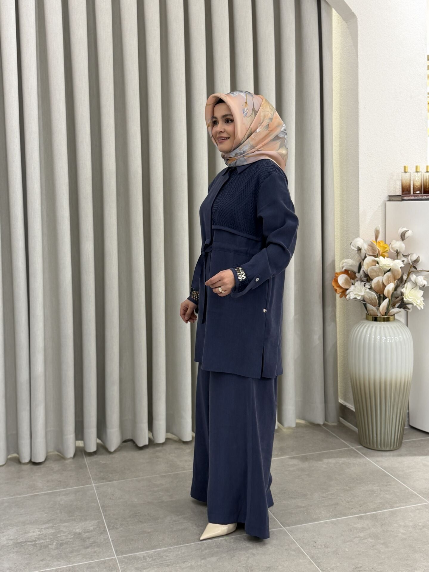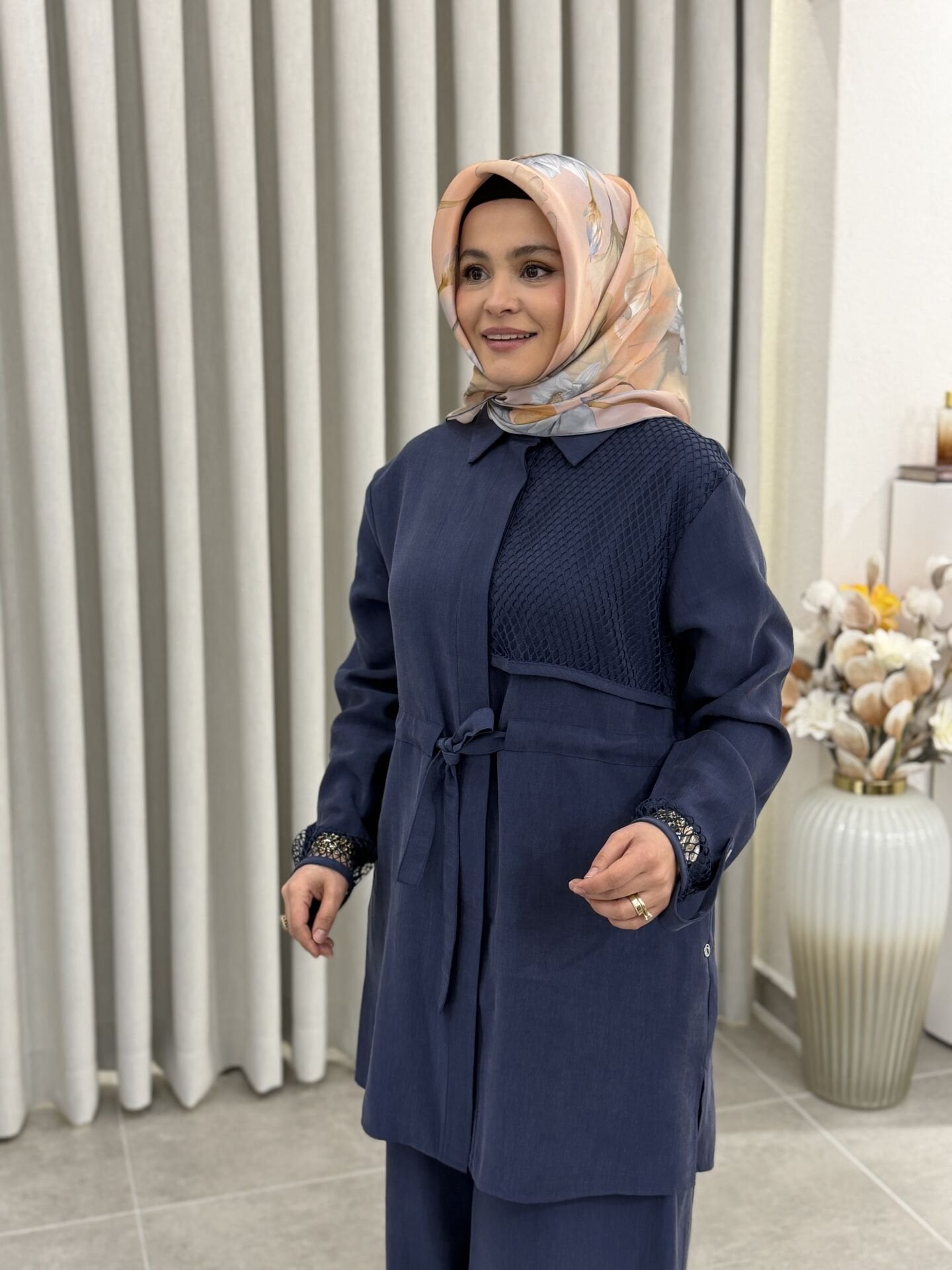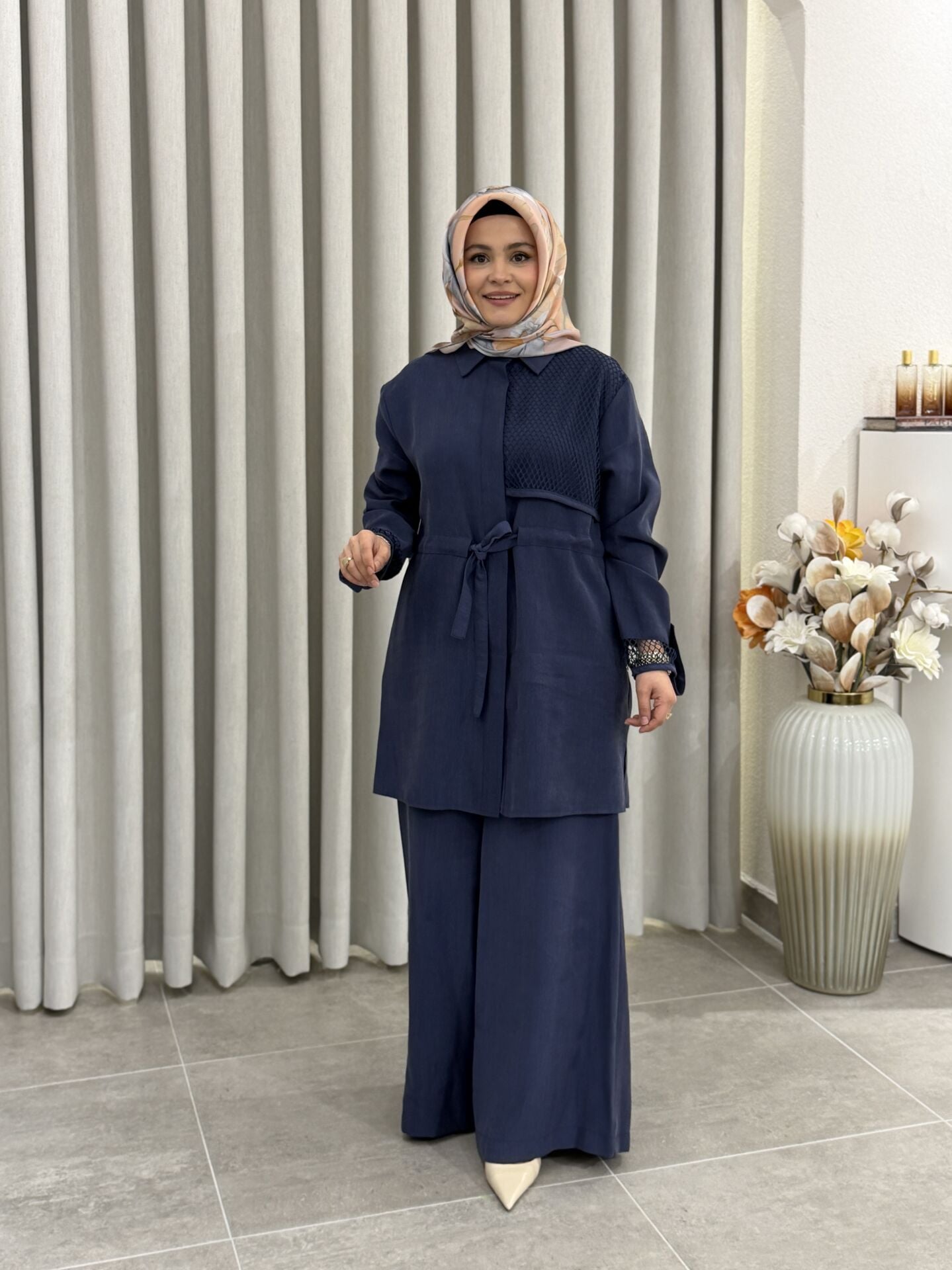 ARMİNE FİLE DETALI TENCEL PANTOLONLU TAKIM İNDİGO
