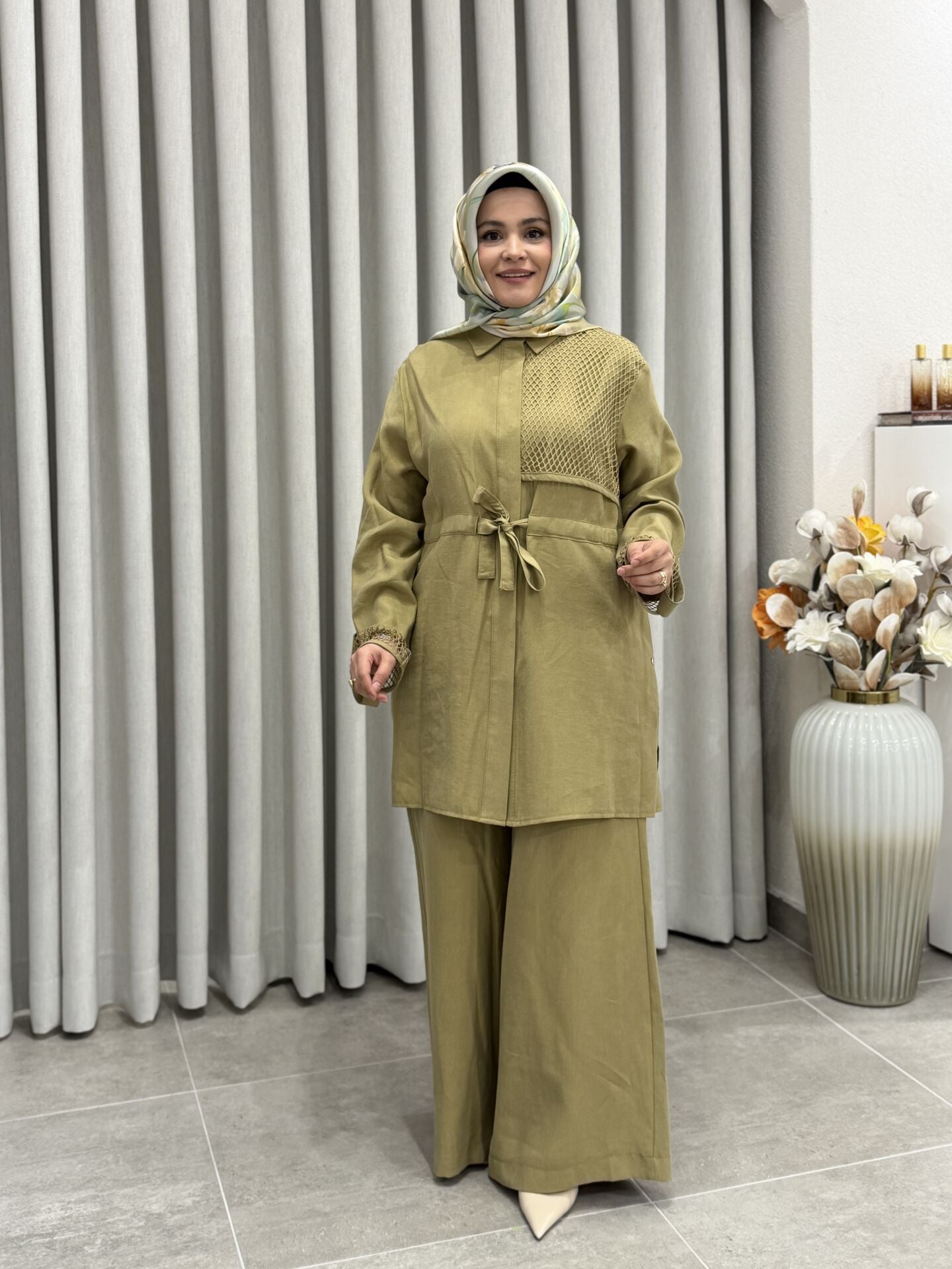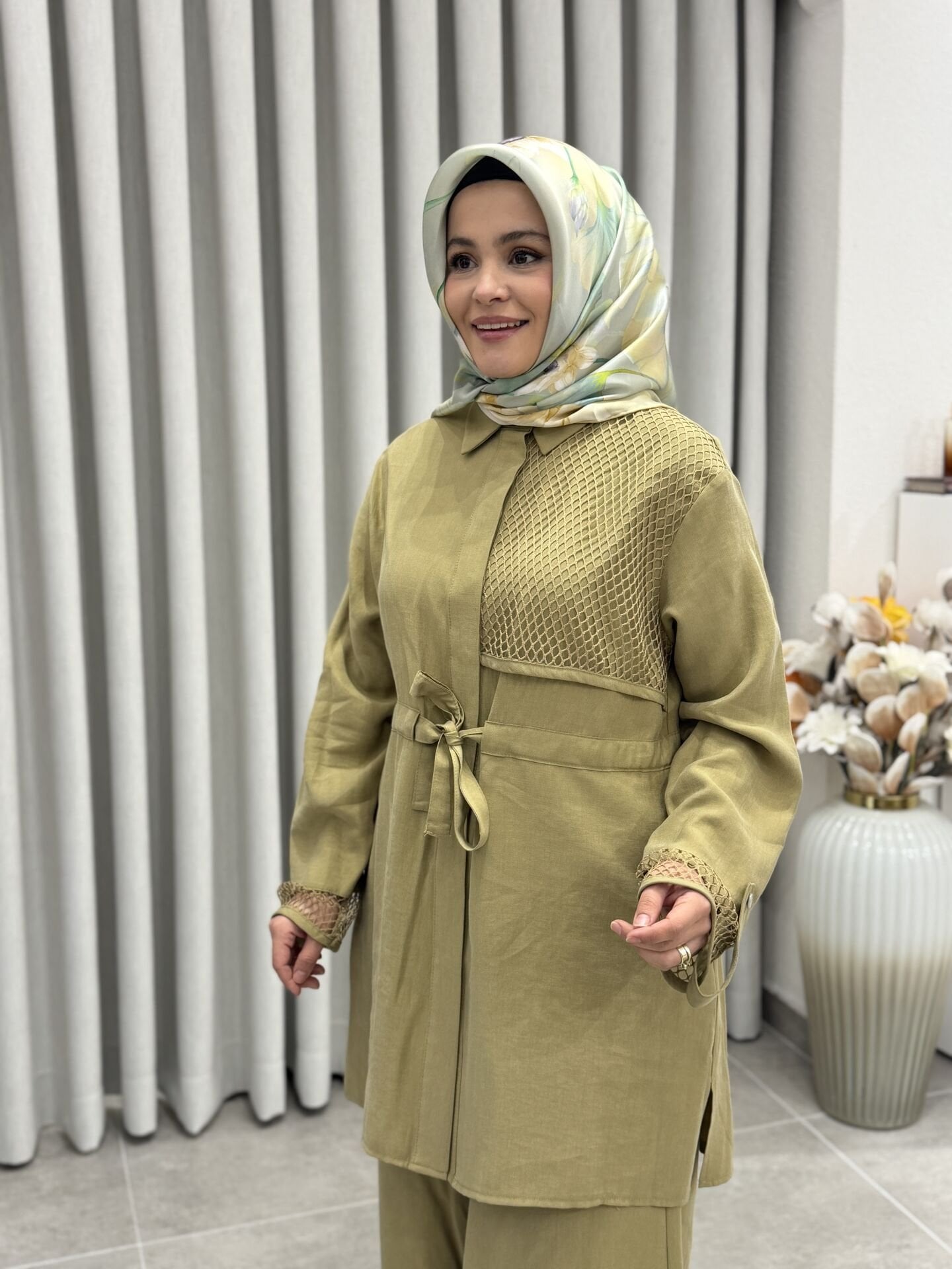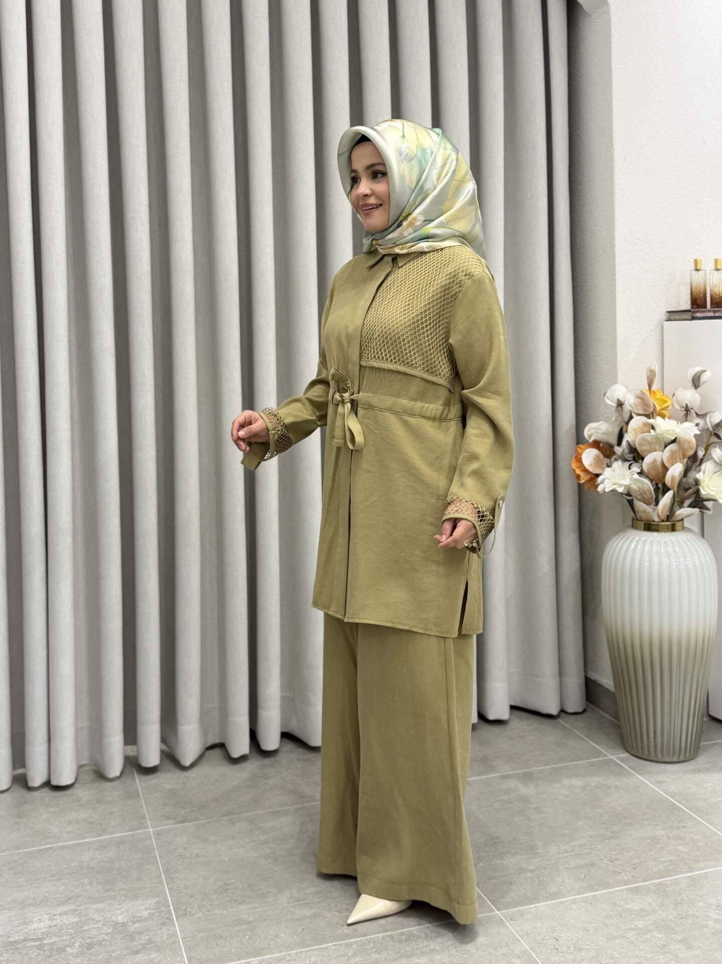 ARMİNE FİLE DETALI TENCEL PANTOLONLU TAKIM YAĞ YEŞİLİ