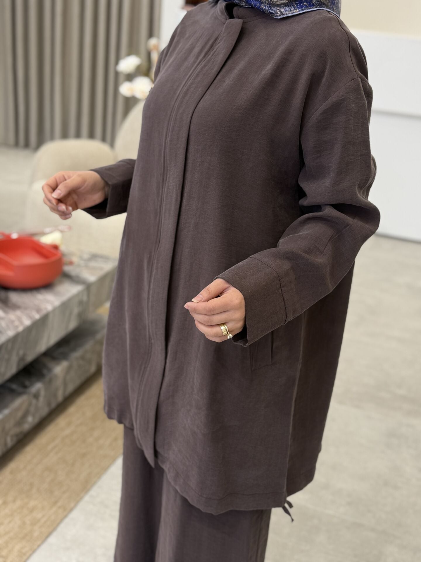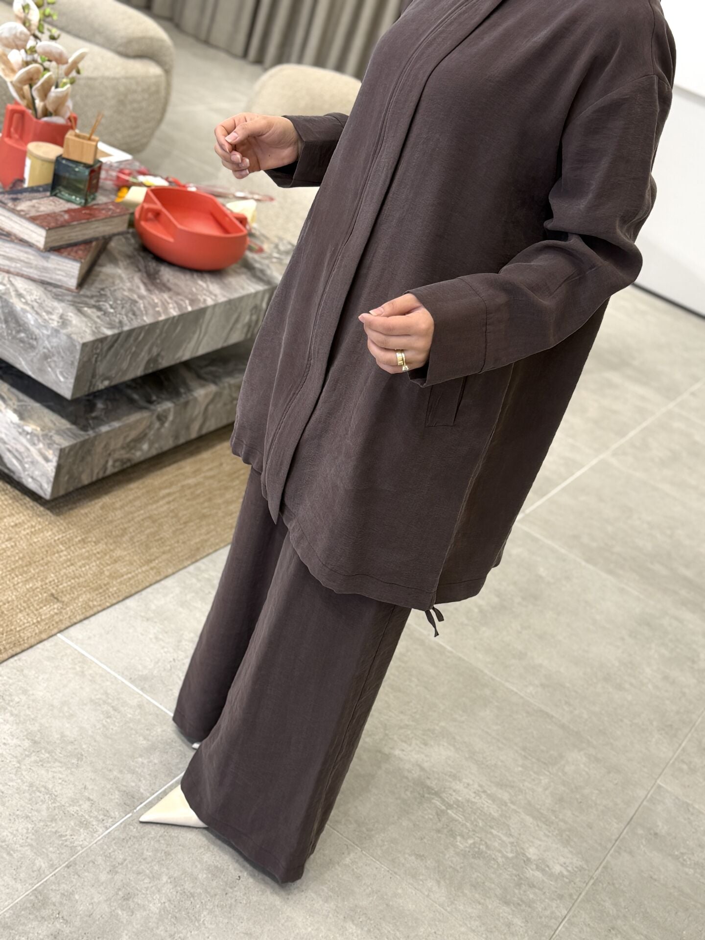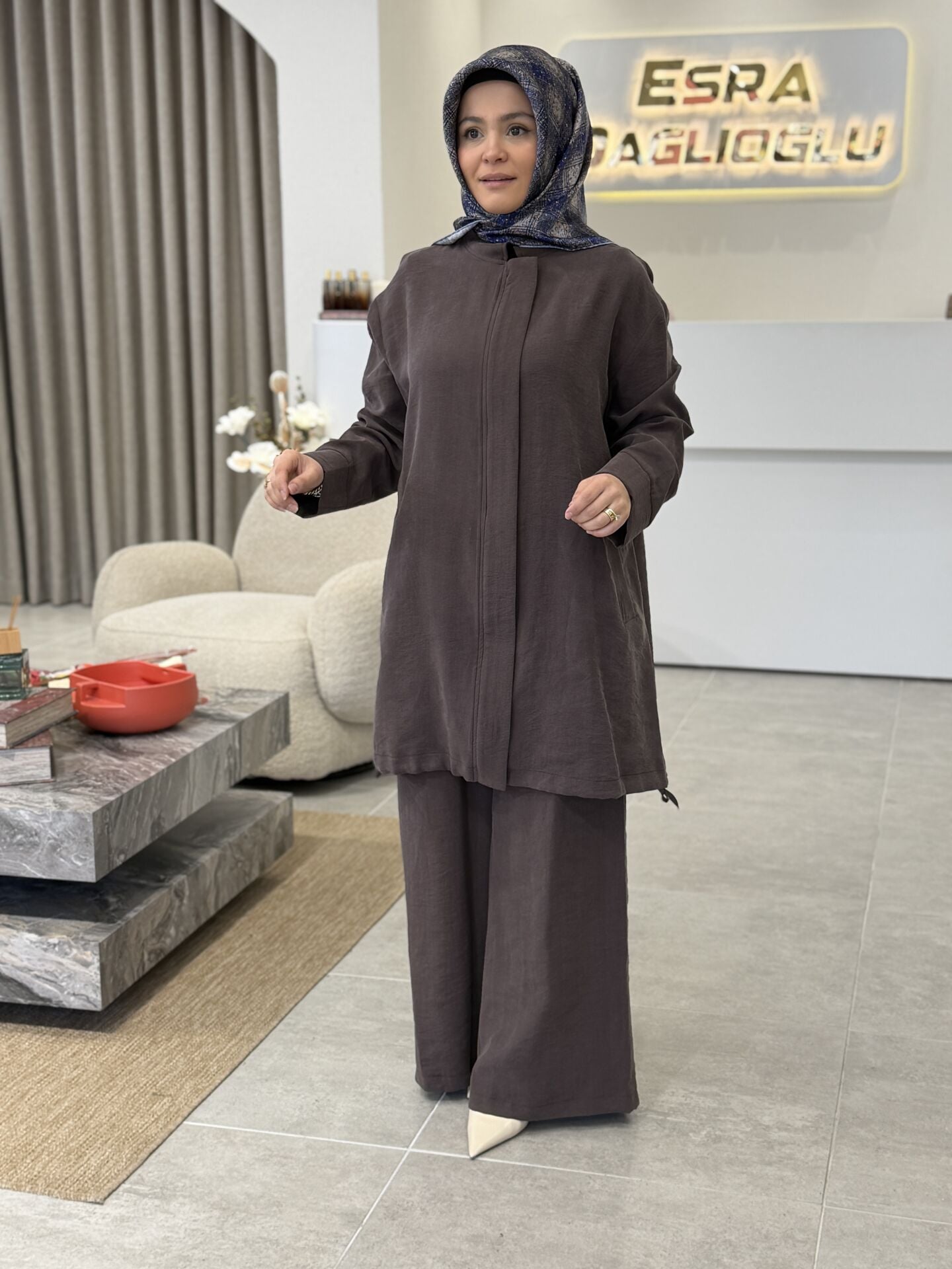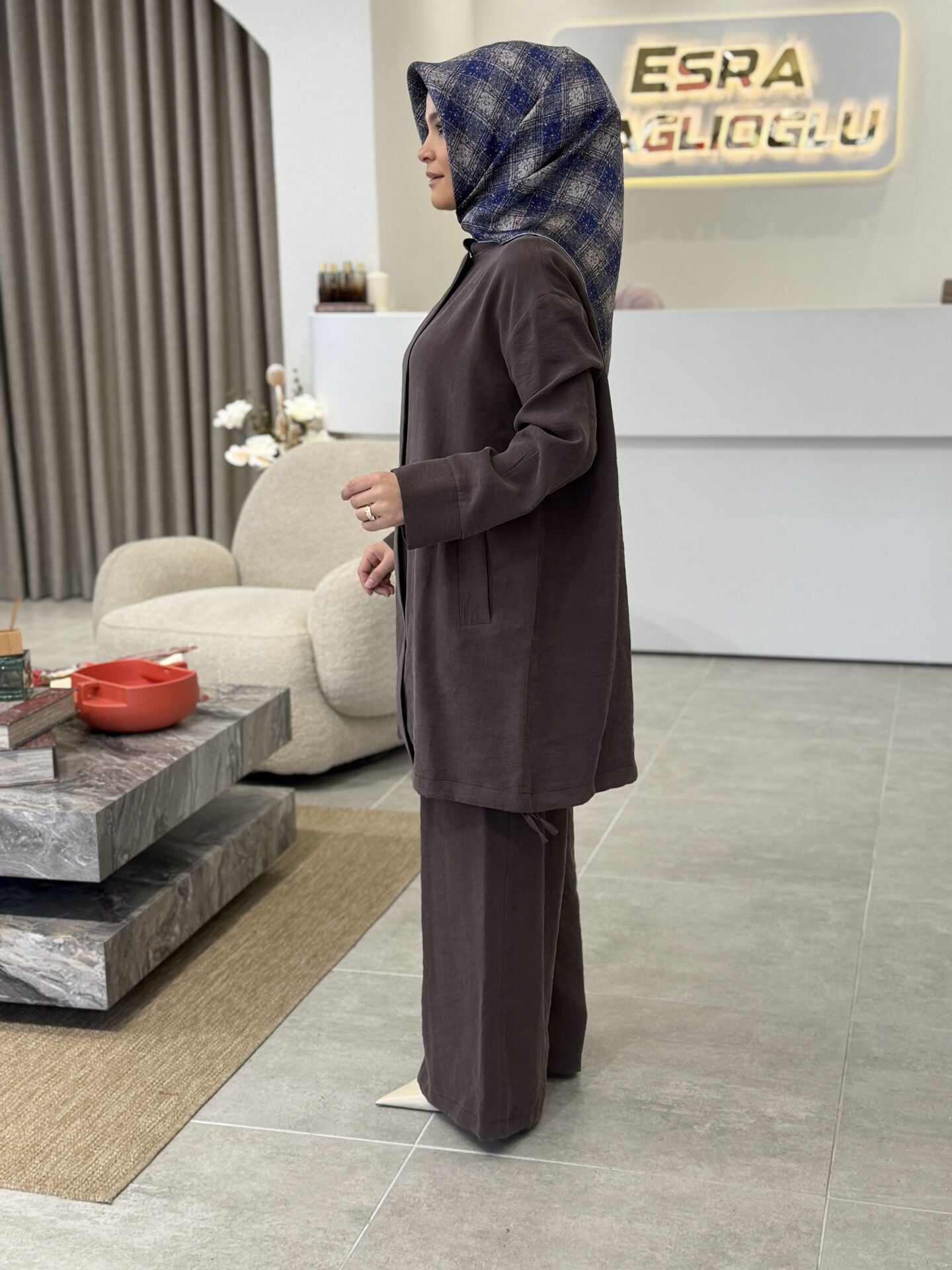 ARMİNE TENCEL PANTOLONLU TAKIM KAHVE