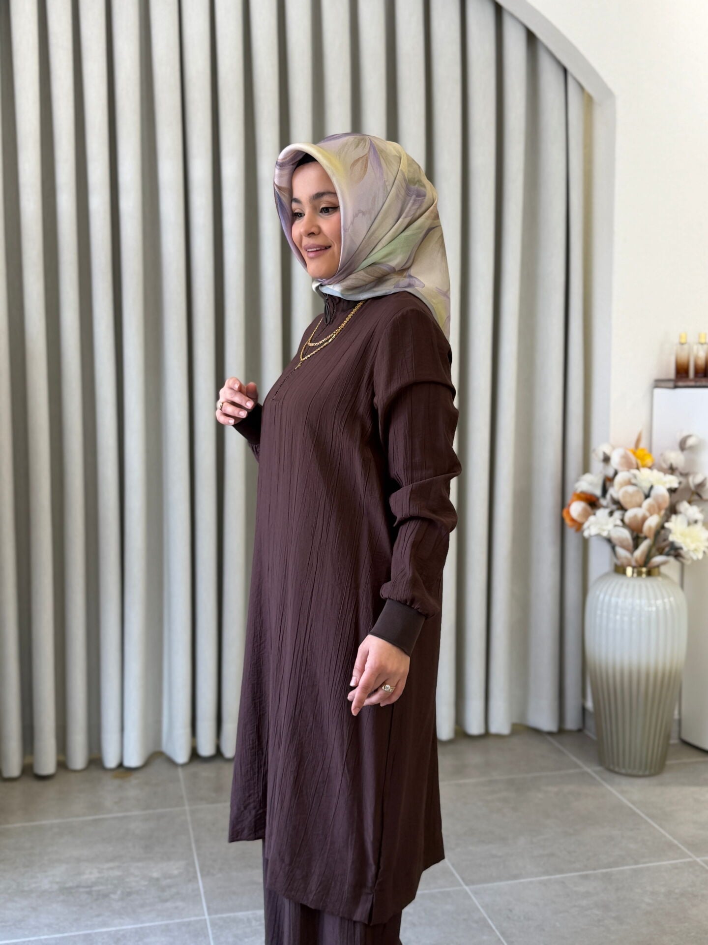 ARMİNE TREND ÇİLEK KUMAŞ TAM BOY TUNİK KAHVERENGİ
