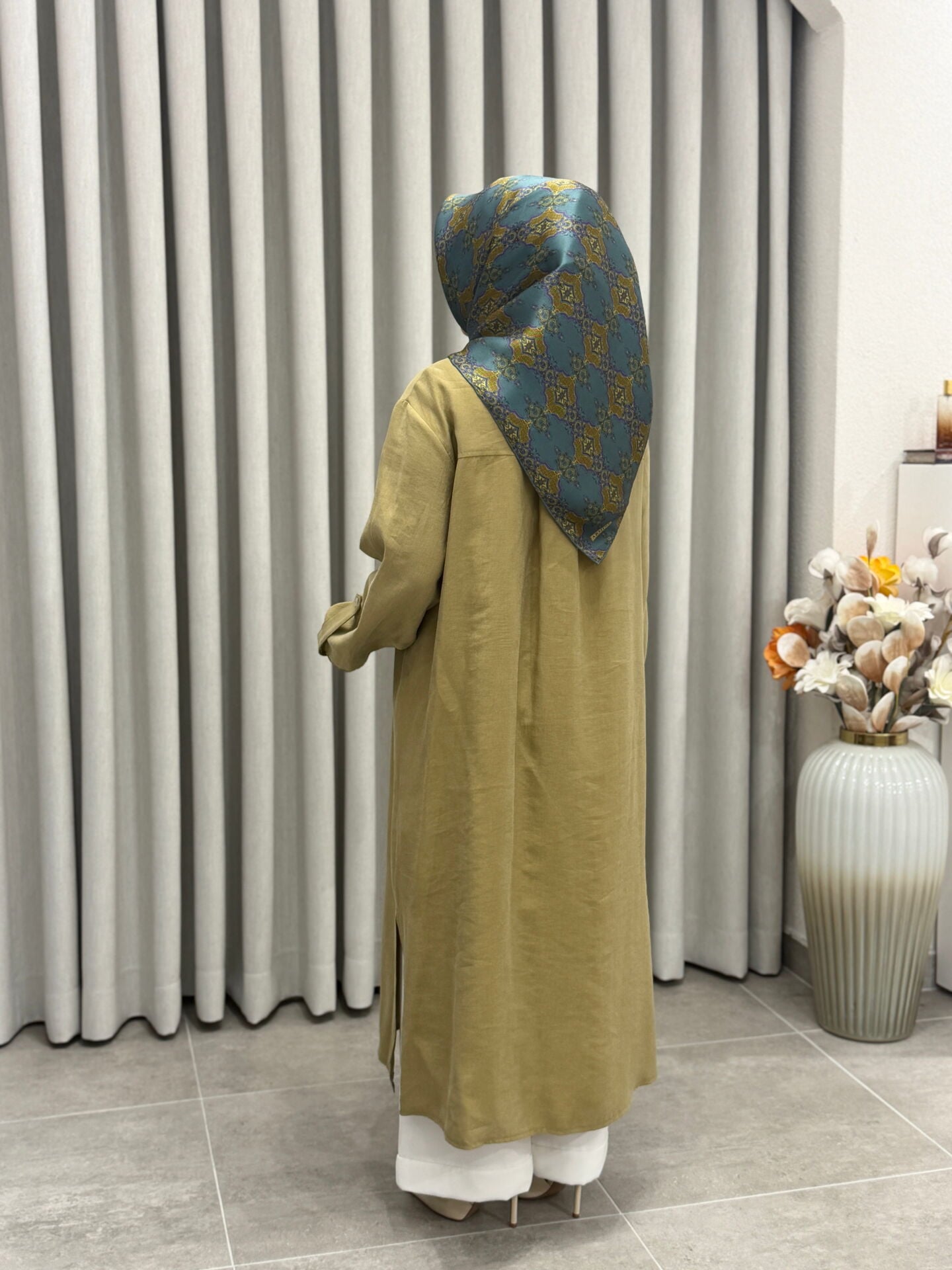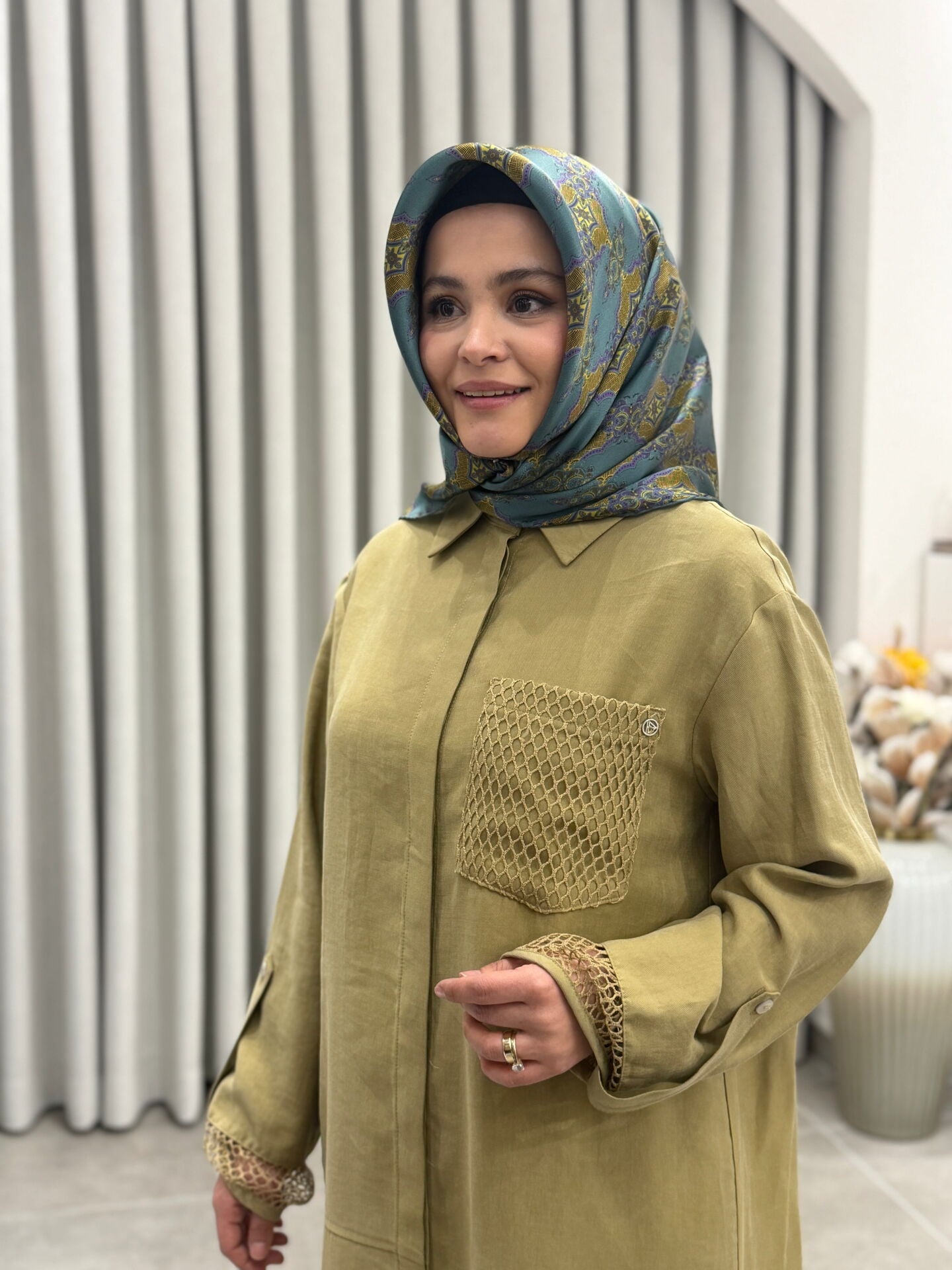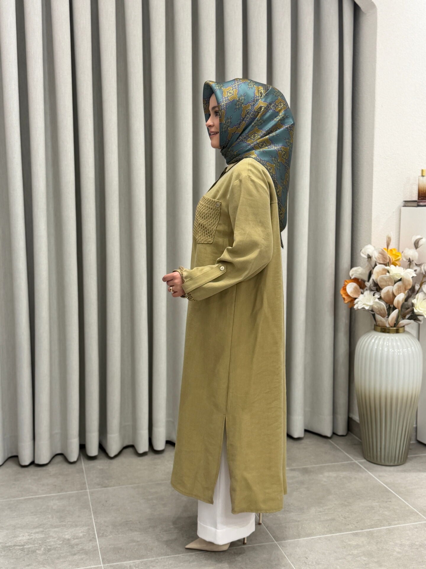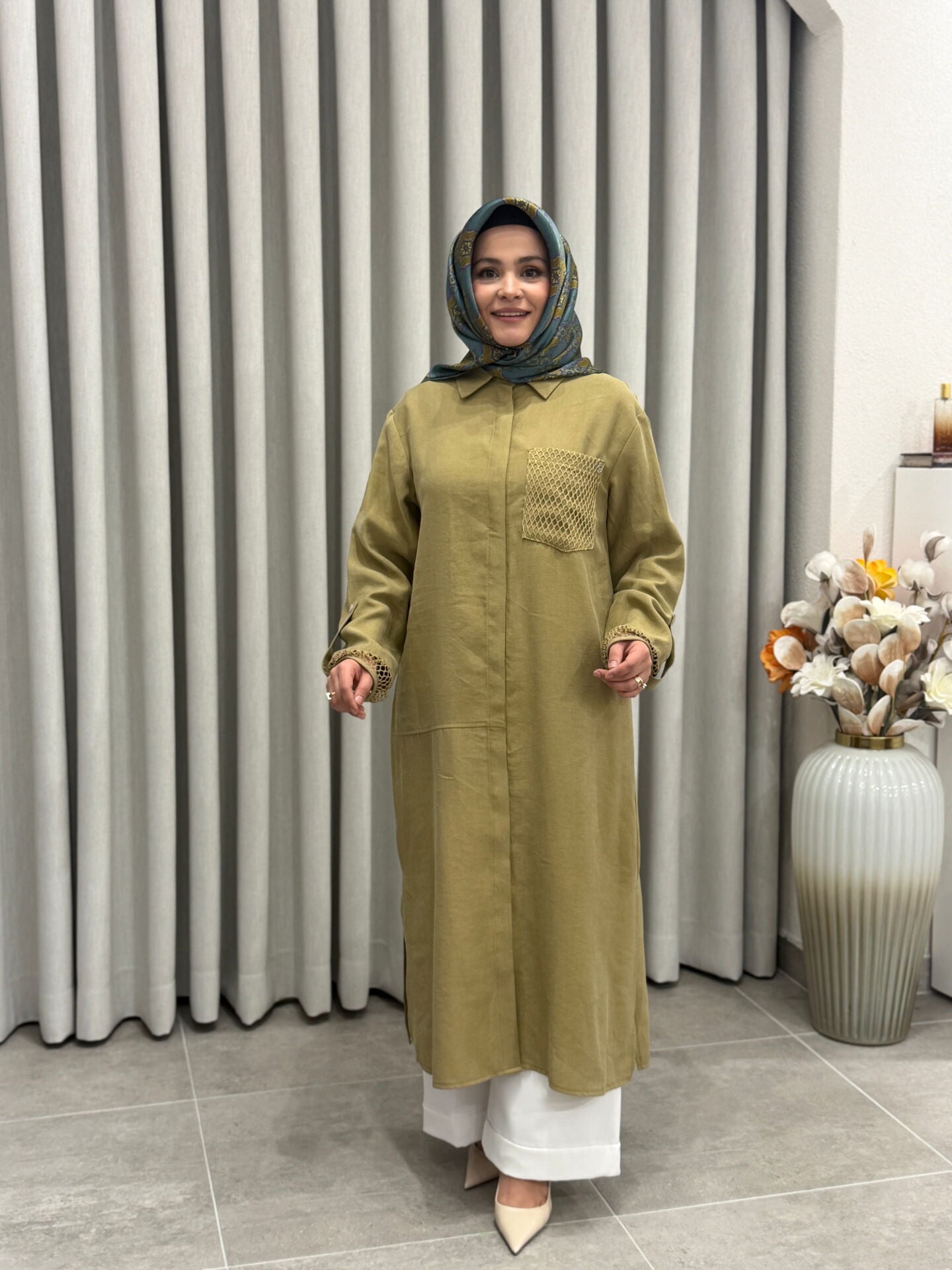 ARMİNE TREND TENCEL KUMAŞ TAM BOY FİLE DETAYLI TUNİK YAĞ YEŞİLİ