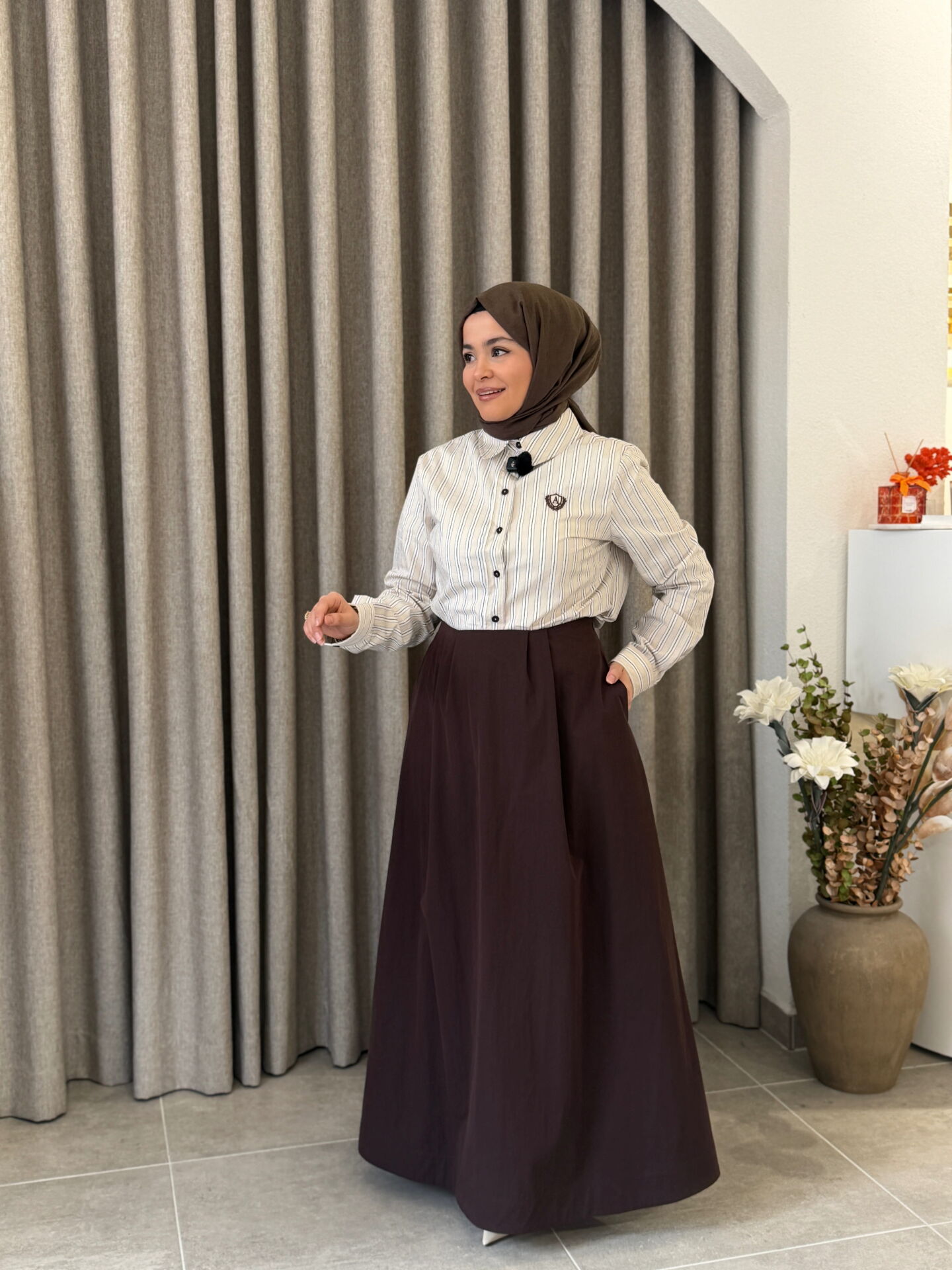 ARMİNE TREND GÖMLEK VE ETEKLİ TAKIM KAHVE