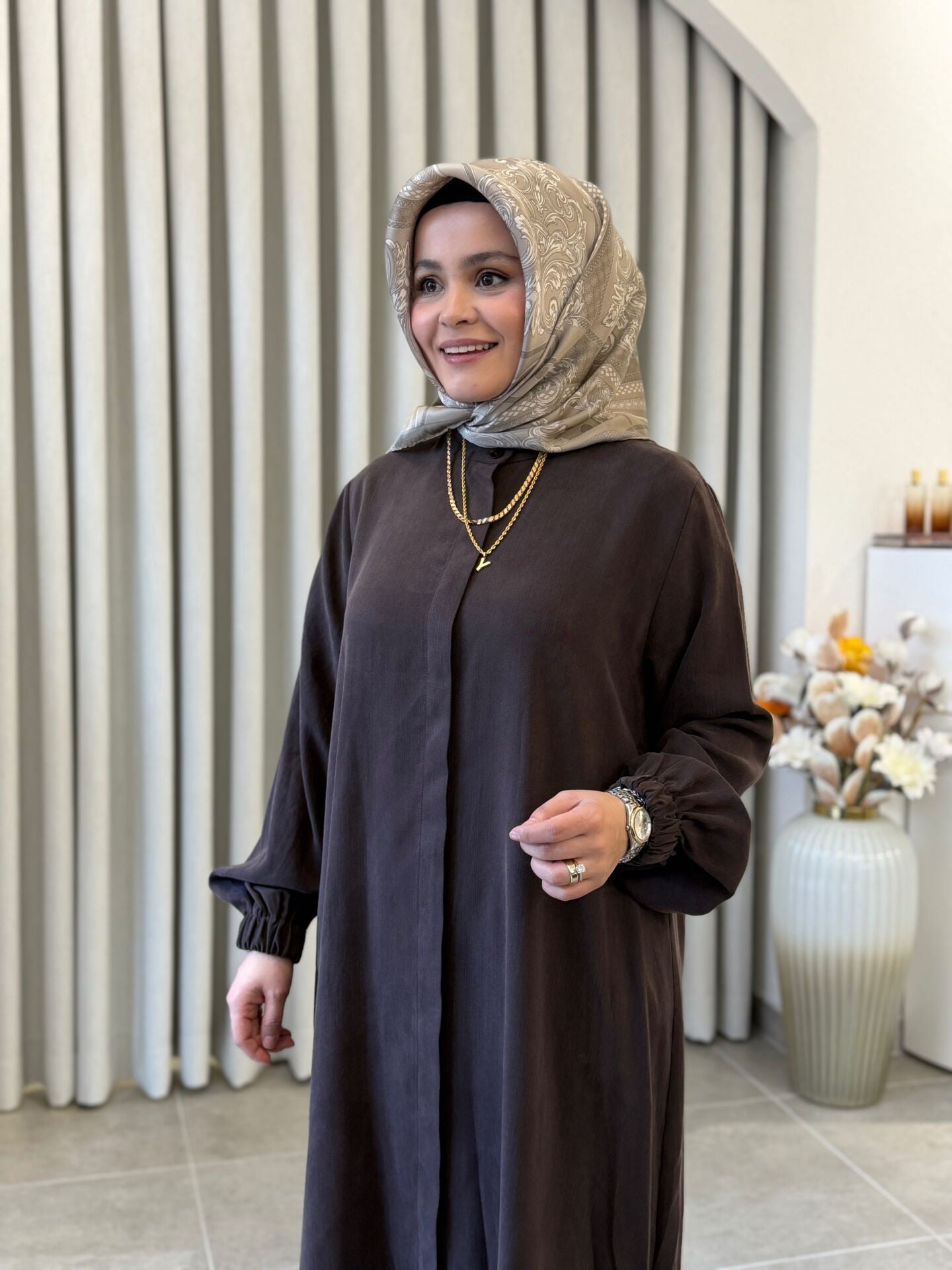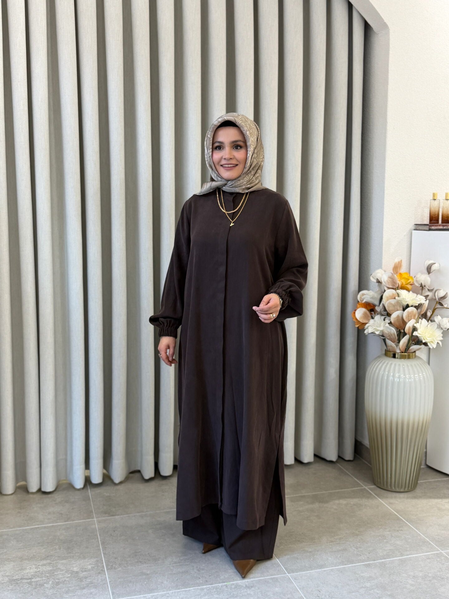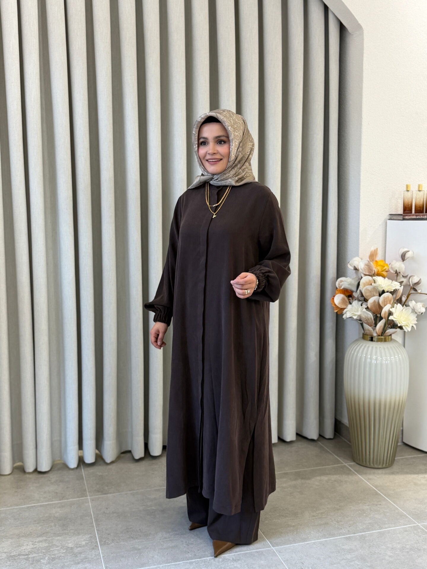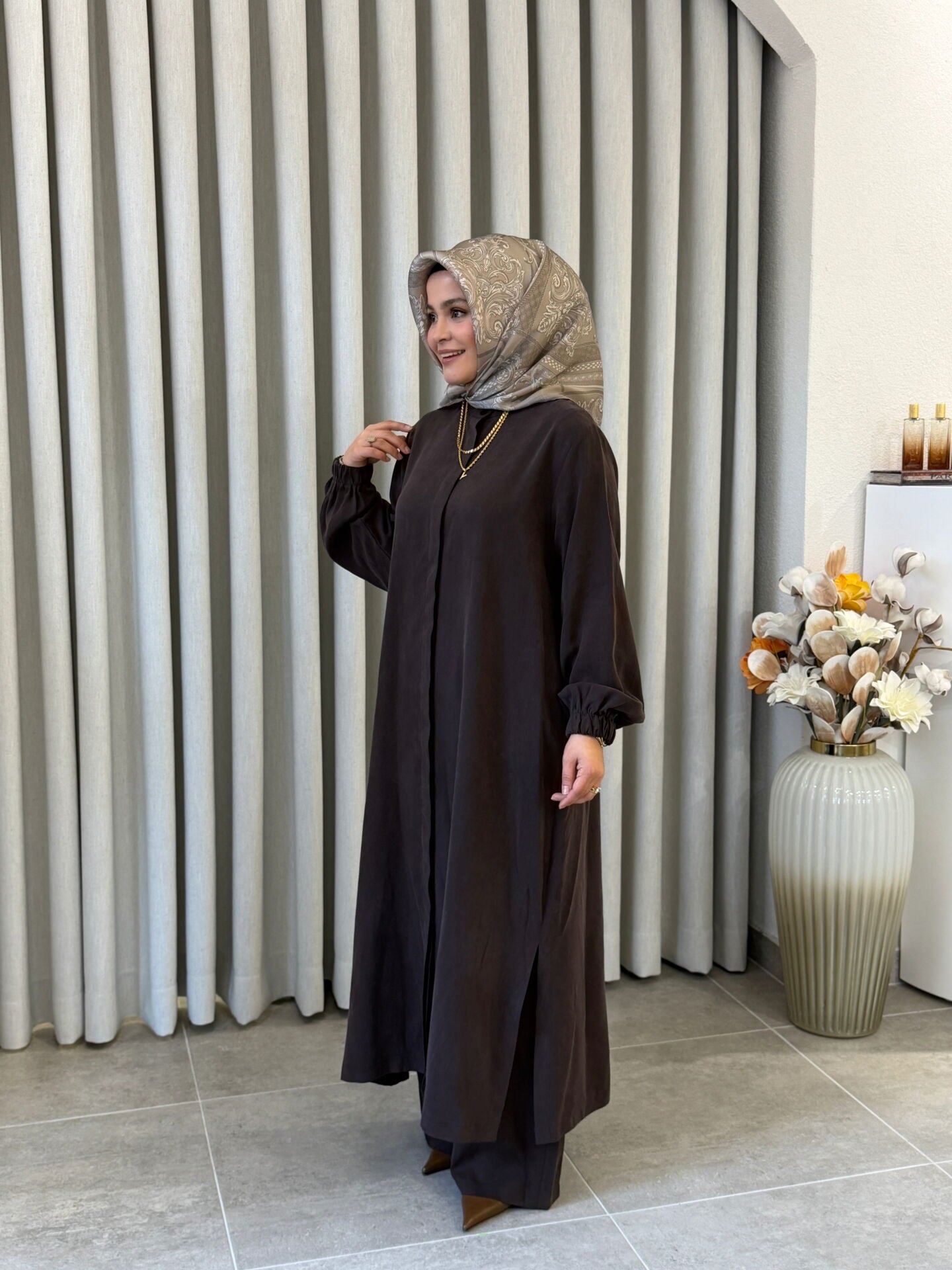 İPEK CUPRA PANTOLONLU TAM BOY TAKIM KAHVE