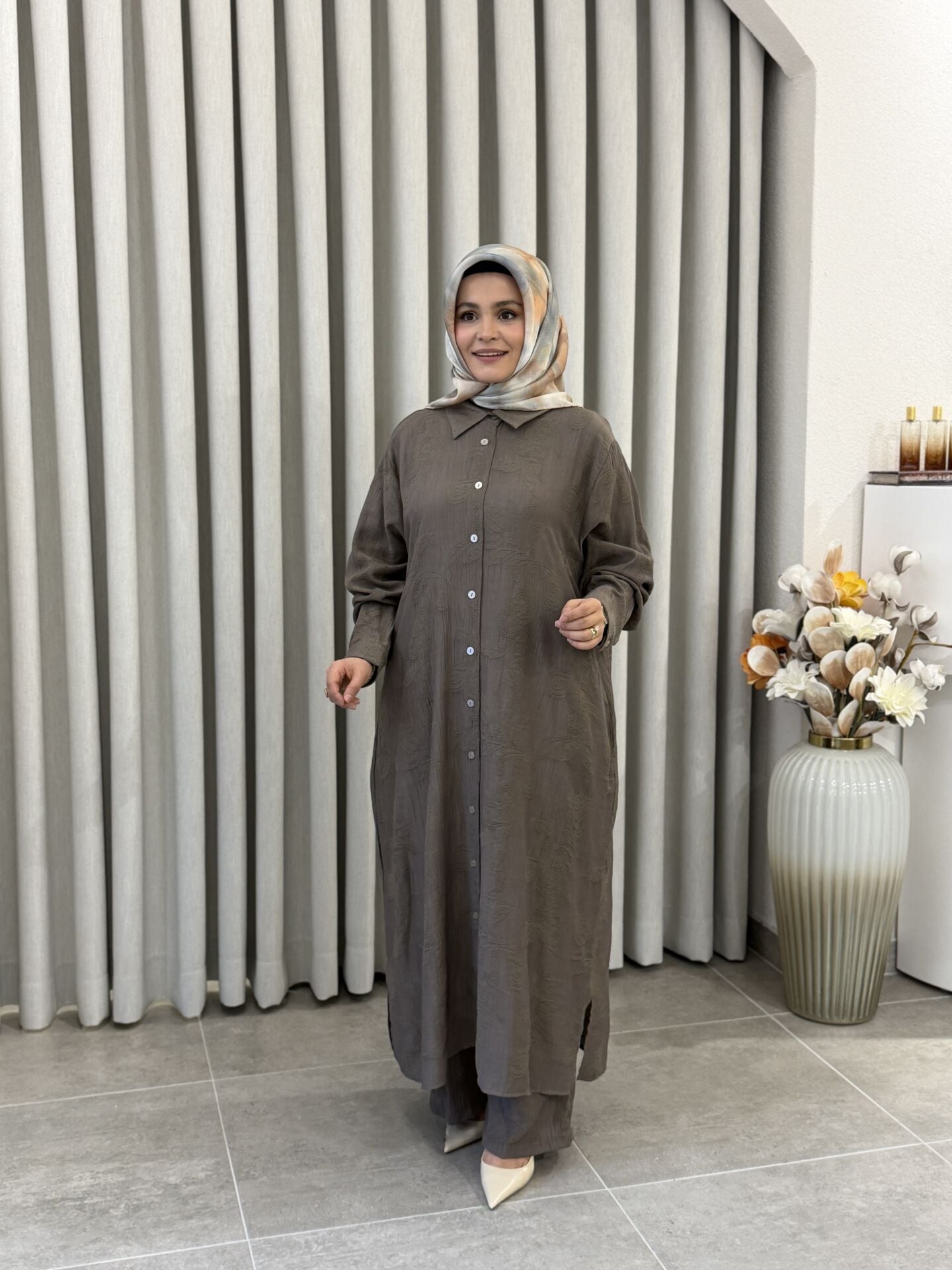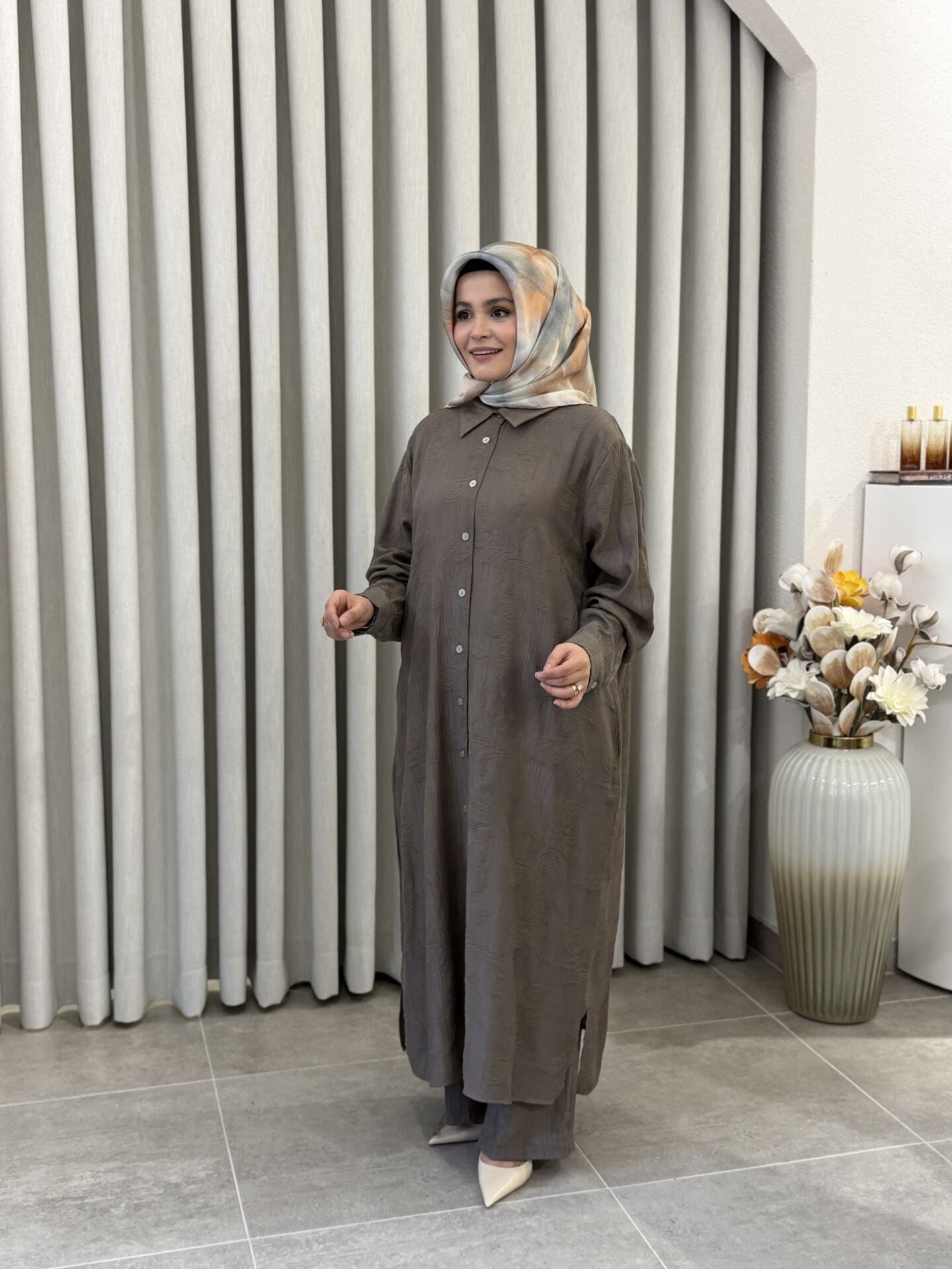 KADO DESENLİ PAMUK TENCEL PANTALONLU TAKIM VİZON BÜYÜK BEDEN