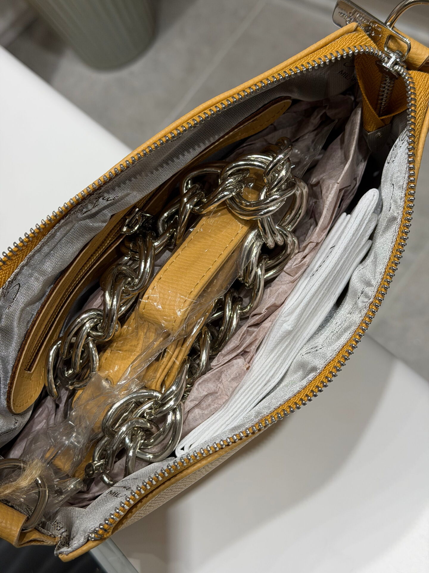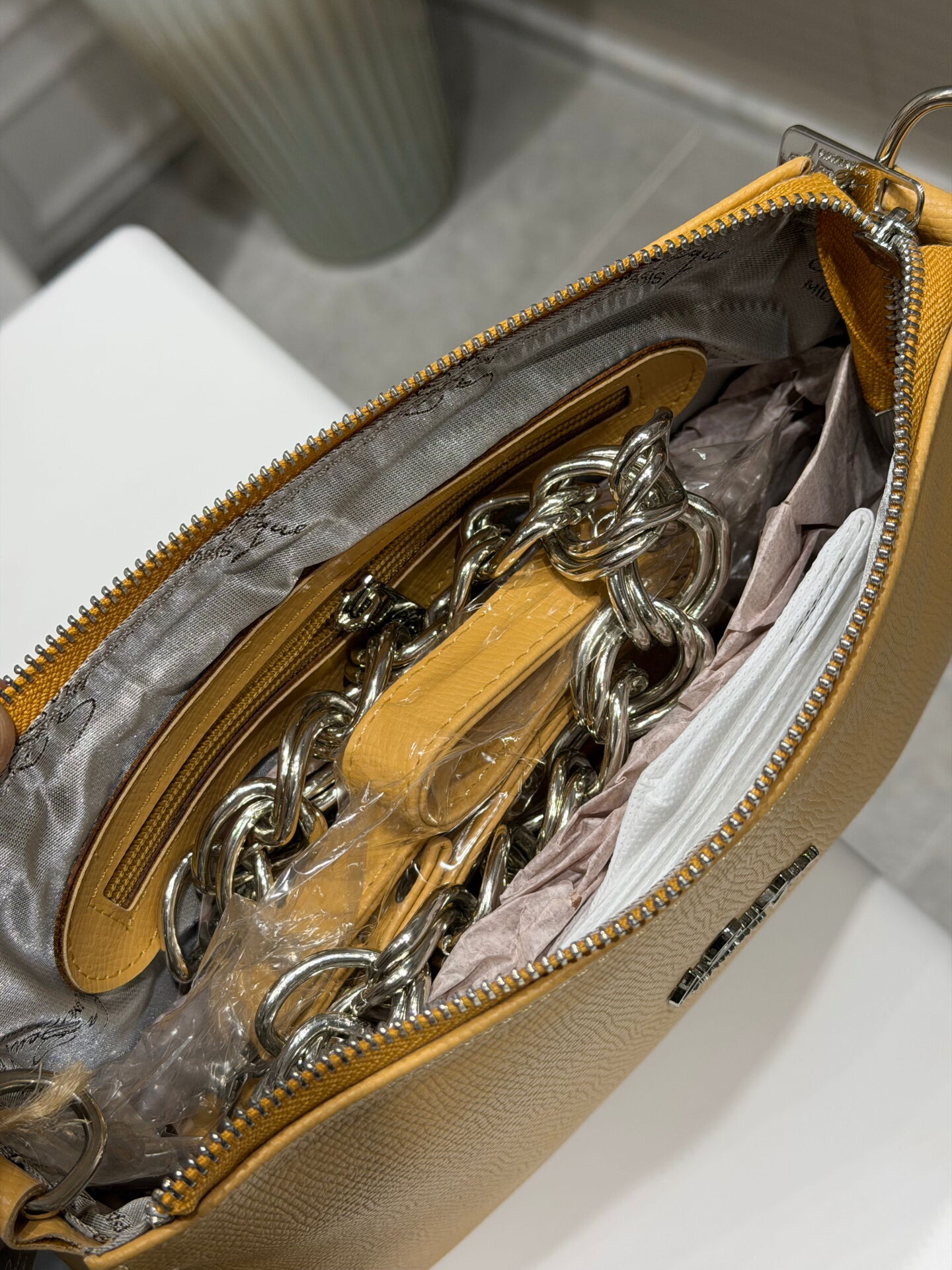 EL ASKISI ZİNCİR DETAYLI OLUP,YAN ÇAPRAZ ASKISI DERİ DETAYLIDIR.