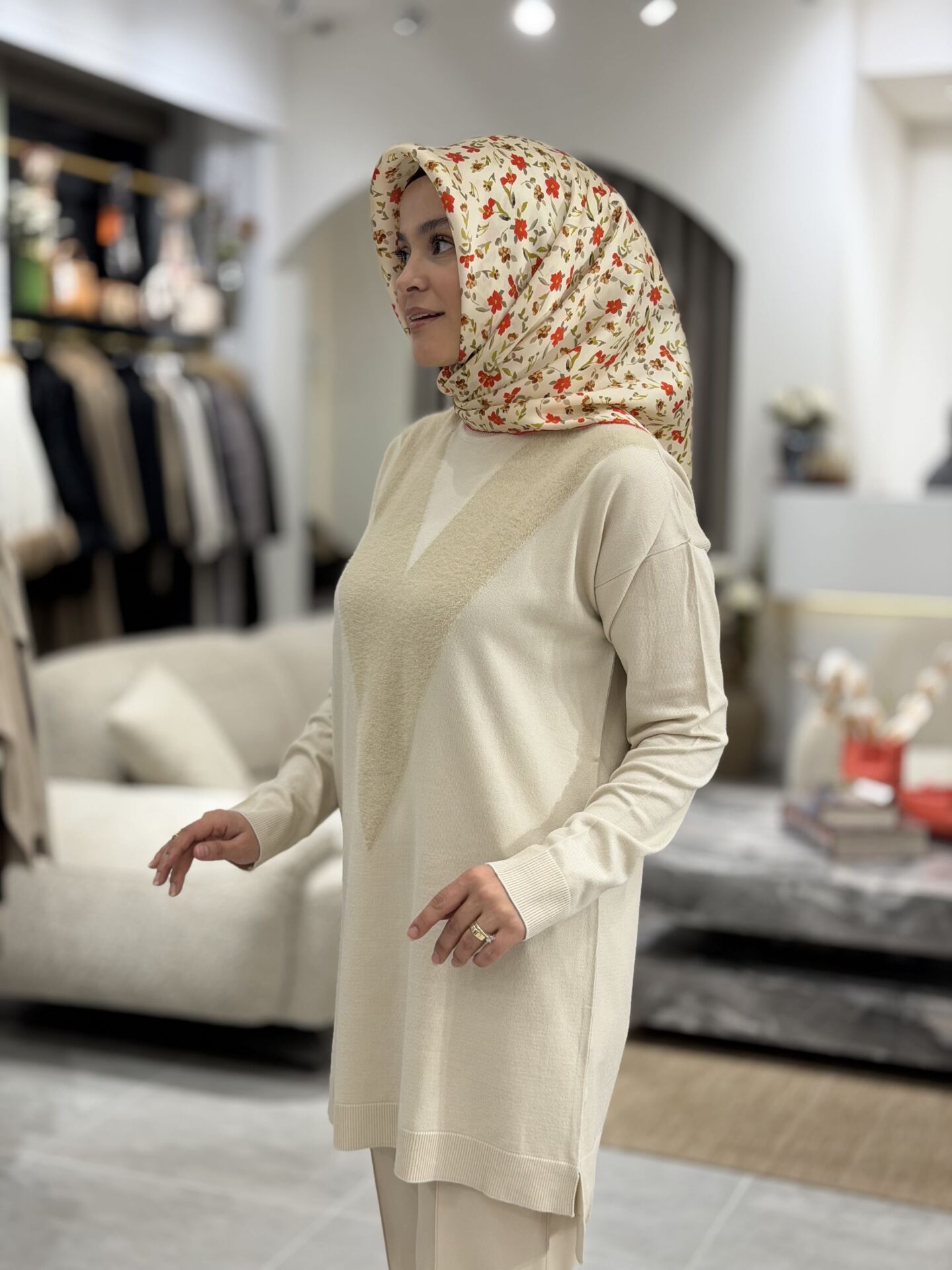 TIĞ TRİKO ÖNÜ V DETAYLI MERSERİZE TRİKO TUNİK BEJ