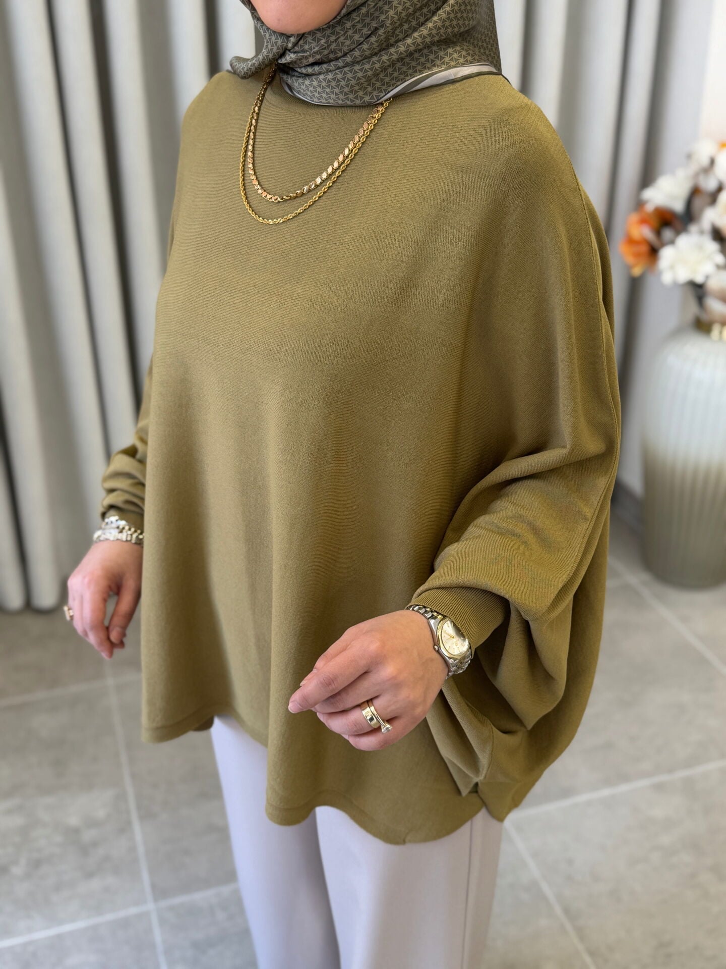 TIĞ TRİKO YARASA KOL SIFIR YAKA BLUZ YAĞ YEŞİLİ